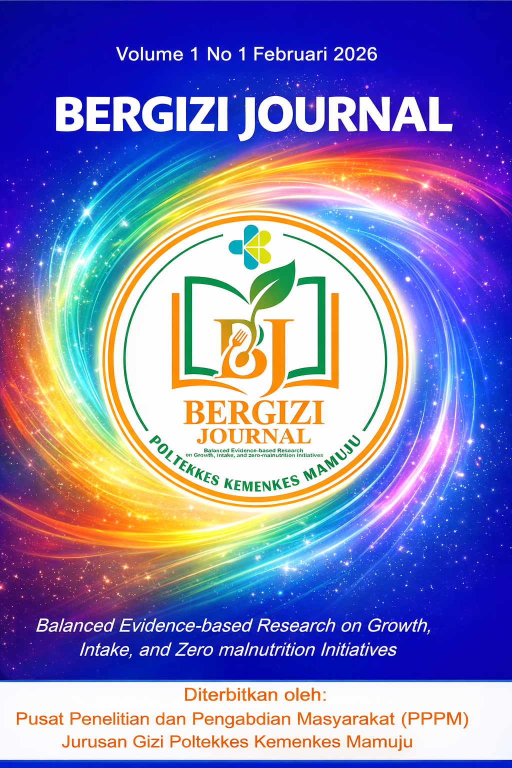 BERGIZI Journal (Balanced Evidence-based Research on Growth, Intake, and Zero-malnutrition Initiatives) adalah jurnal ilmiah yang berfokus pada publikasi karya ilmiah di bidang gizi, kesehatan masyarakat, nutrisi klinis, dan ilmu kesehatan terkait. Jurnal ini hadir sebagai platform akademik untuk menyebarluaskan bukti ilmiah yang seimbang (balanced evidence) guna mendukung peningkatan status gizi, pola konsumsi yang lebih baik, dan upaya eliminasi malnutrisi pada seluruh kelompok usia.