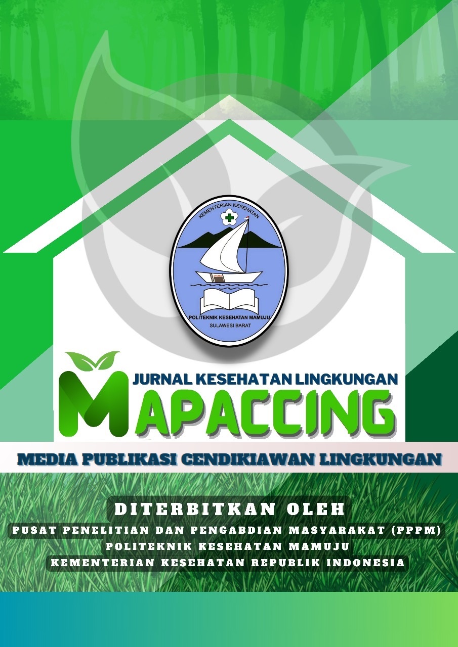 Jurnal Kesehatan Lingkungan Mapaccing adalah Jurnal kesehatan dan lingkungan untuk mewadahi hasil penelitian yang berkaitan dengan kesehatan lingkungan, efek pencemaran lingkungan pada kesehatan manusia, teknologi pengelolaan lingkungan dan kebijakan kesehatan lingkungan yang diterbitkan oleh Pusat Penelitian dan Pengabdian Masyarakat (PPPM), Jurusan Kesehatan Lingkungan - Poltekkes Kemenkes Mamuju, Indonesia